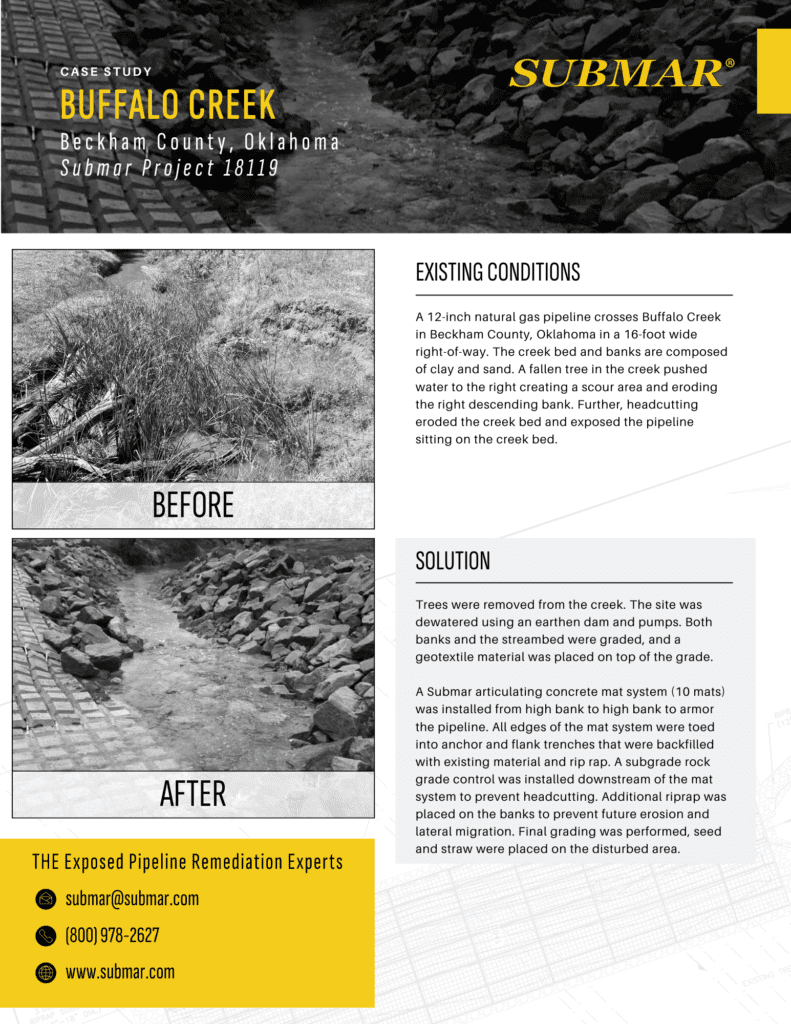 Submar Case Study – In our latest case study, discover how Submar protected a 12-inch natural gas pipeline that was exposed due to headcutting and meandering at Buffalo Creek in Beckham County, Oklahoma. The site was dewatered using an earthen dam and pumps. Both banks and the streambed were graded, and a geotextile material was placed on top of the grade. A Submar articulating concrete mat system was installed from high bank to high bank to armor the pipeline. All edges of the mat system were toed into anchor and flank trenches that were backfilled with existing material and rip rap. A subgrade rock grade control was installed downstream of the mat system to prevent headcutting. Additional riprap was placed on the banks to prevent future erosion and lateral migration.