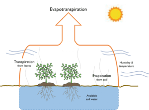 Plants and grass intercept rainfall, causing absorptive and evaporative losses that reduce surface water runoff and erosion. Evergreen trees and shrubs continue the metabolic activity known as evapotranspiration, which extracts moisture from the soil. Wet soil can lead to land-slides. Roots reinforce the soil, increasing lateral soil sheer strength and cohesion during saturated conditions.
