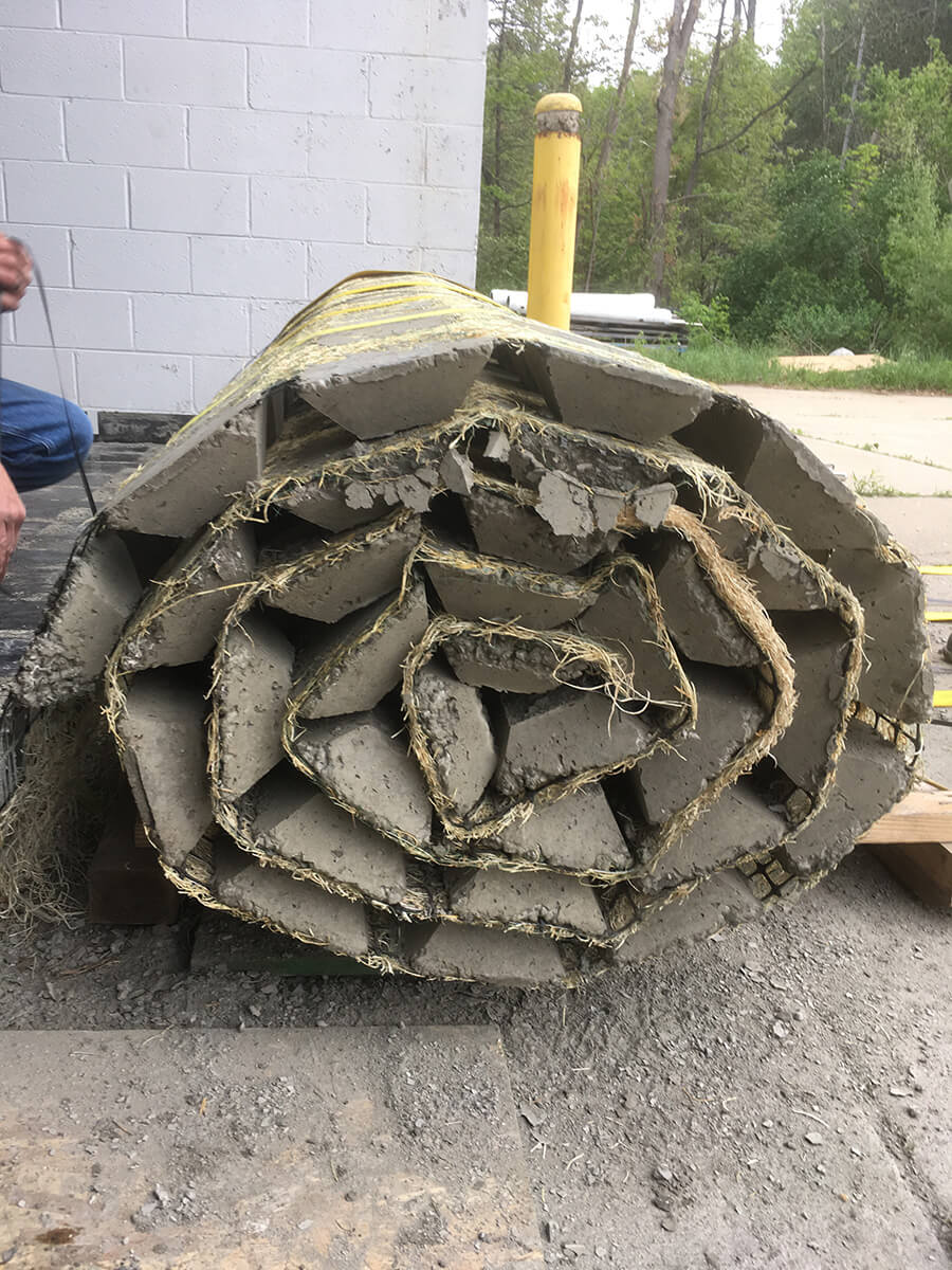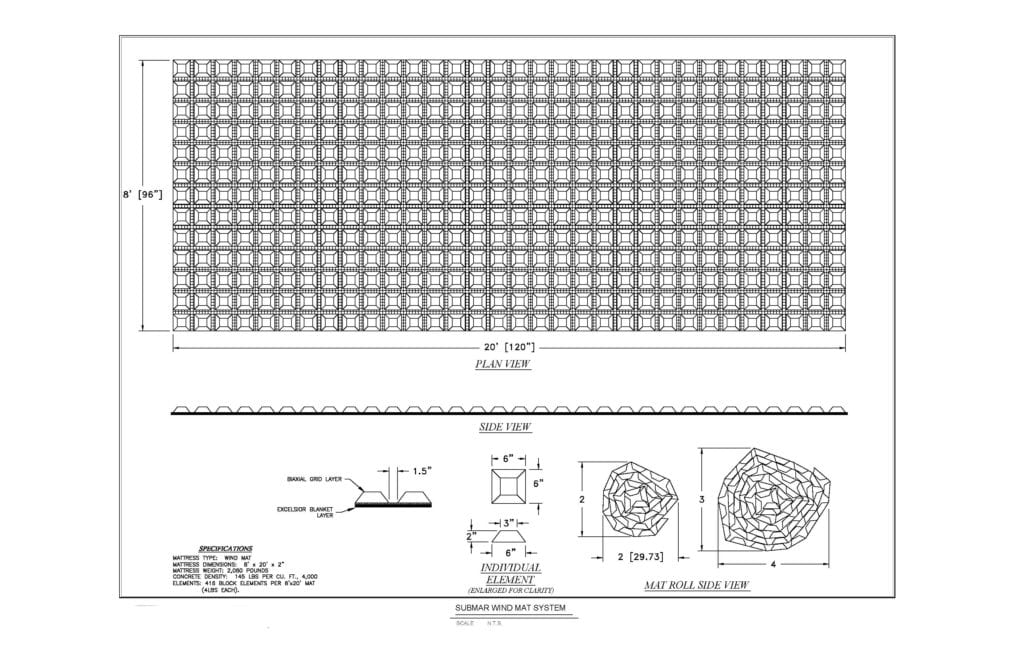 The mats typically are picked up with forks on a skid steer and straddle the pipeline before being set down. The mats are rolled out by hand and with the help of an excavator. A future improvement to installation will include rolling the wind mats on a tube and using spreader bars in order to avoid rolling by hand.