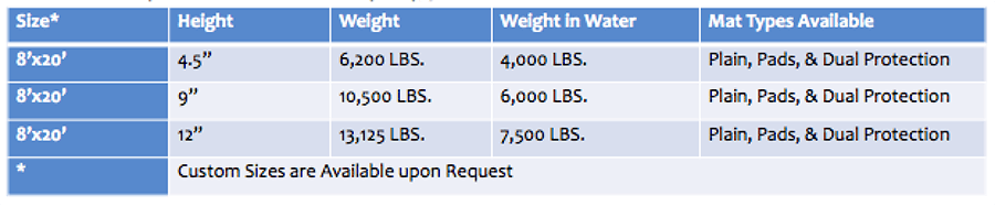 AVAILABLE SIZES of Articulated Concrete Mats (ACM)
