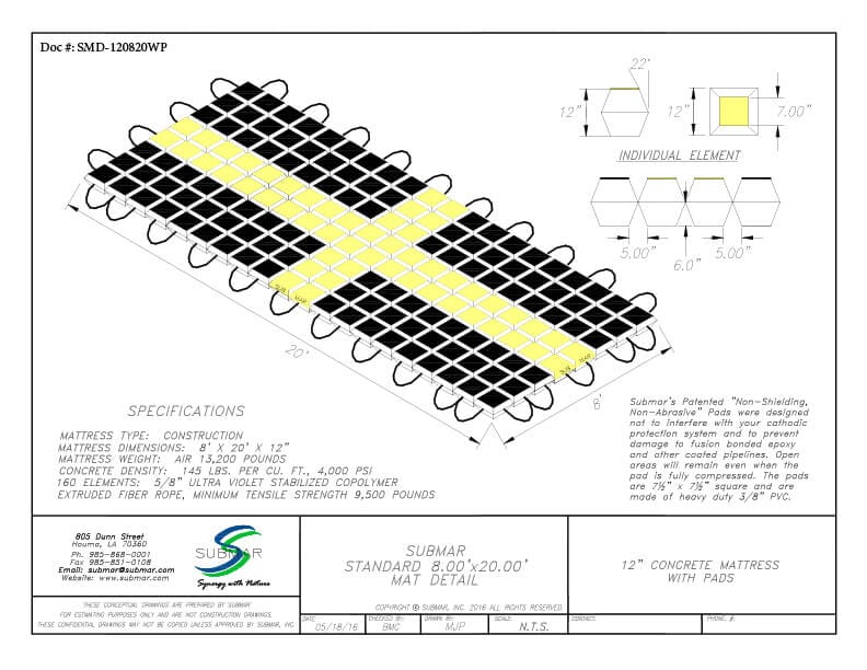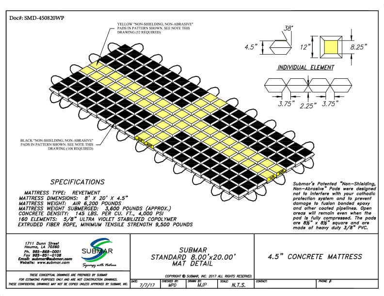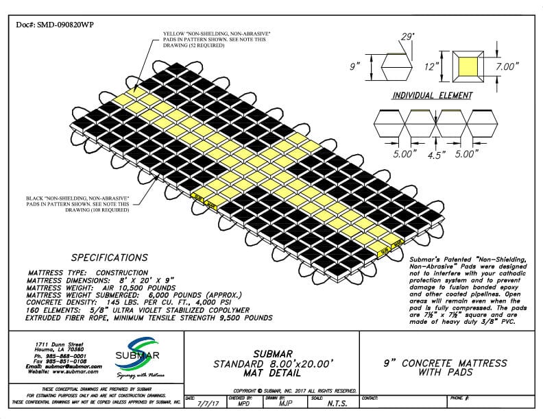 Submar mats can be supplied with patented non-shielding, non-abrasive pads. These pads were developed to protect thin-filmed epoxy coated pipelines from contacting our concrete mats. The pads are 7-1/2” x 7-1/2” square and are made of heavy duty, 3/8” P.V.C.