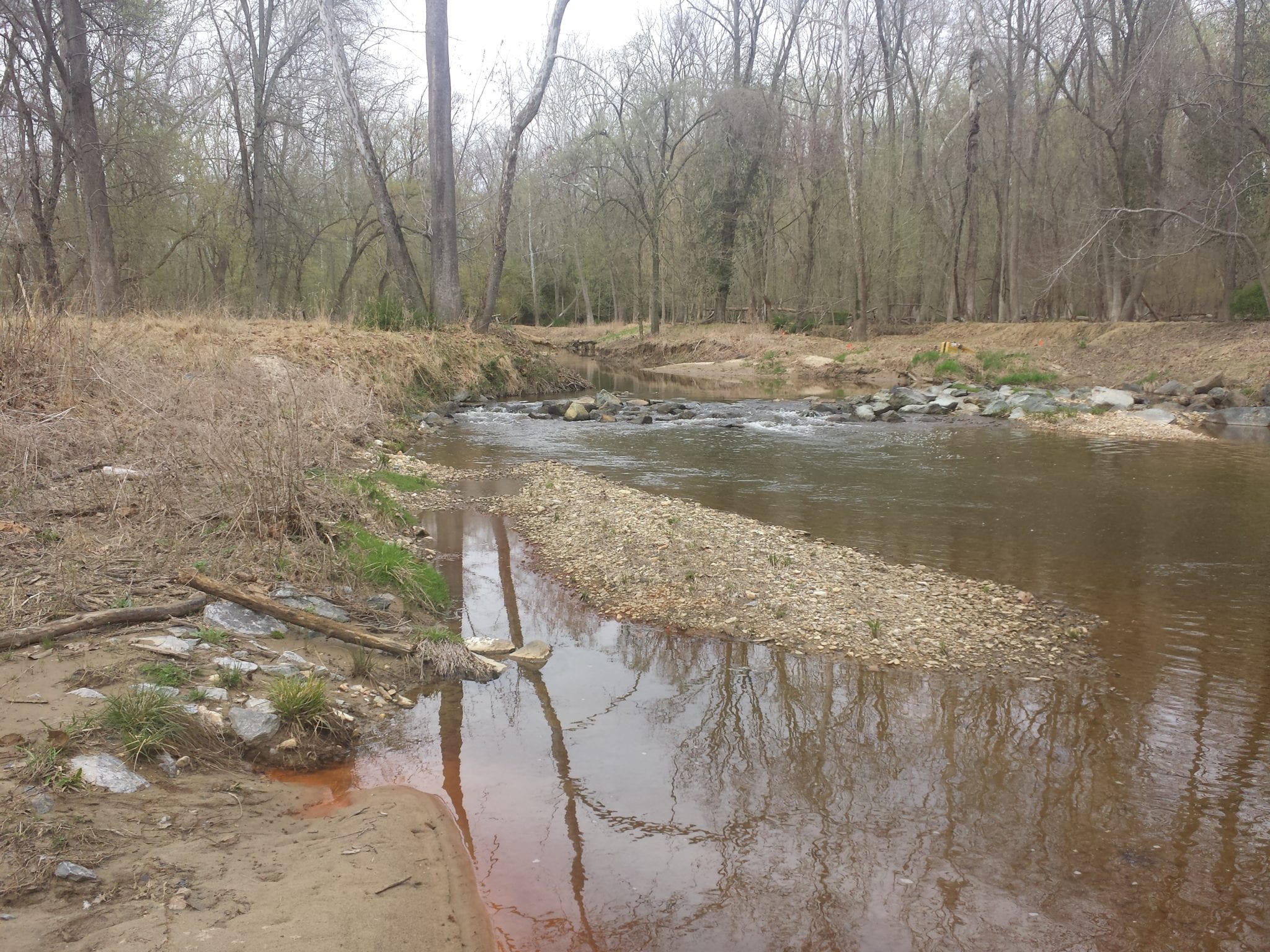 - Next, material from the streambed was placed on top of the mat system in the form of constructed riffles to dissipate stream velocity.
