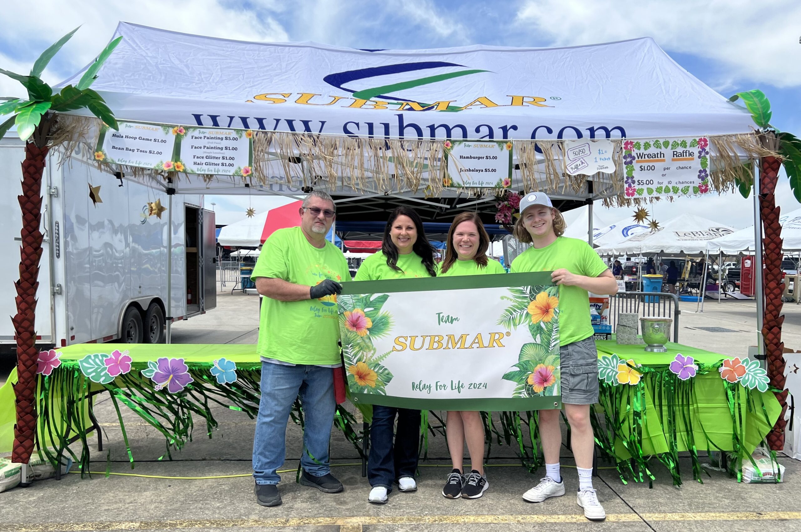 Team Submar had a great time participating in the Terrebonne Parish Relay for Life at the Barry P. Bonvillan Civic Center in Houma. The Submar team raised funds for the American Cancer Society at this event by selling jambalaya, hamburgers, and plate lunches. We also had face painting for the kids, and donated items for the live auction. Our camp theme was “Luau for a Cure.” We hope these funds will assist those who are battling cancer as well as support research to find a cure. Thanks to all who participated from Submar.